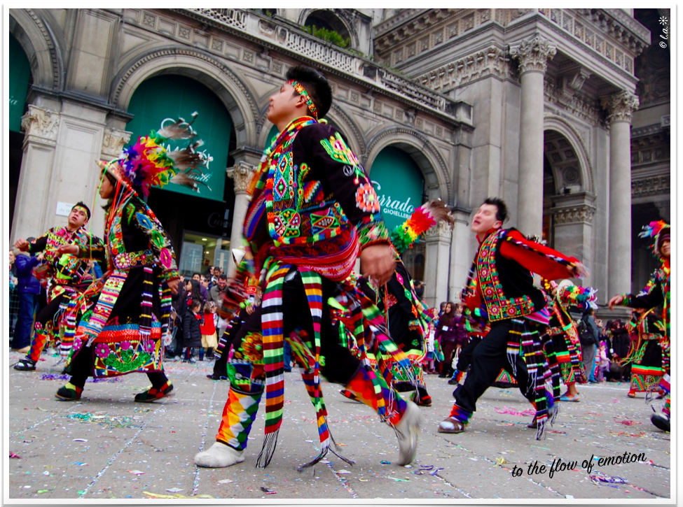 En Italie, je fus touchée par la beauté de la valorisation des différentes danses traditionnelles dont celles d’Amérique latine lors du carnaval ambrosien de Milan. (en 2011)