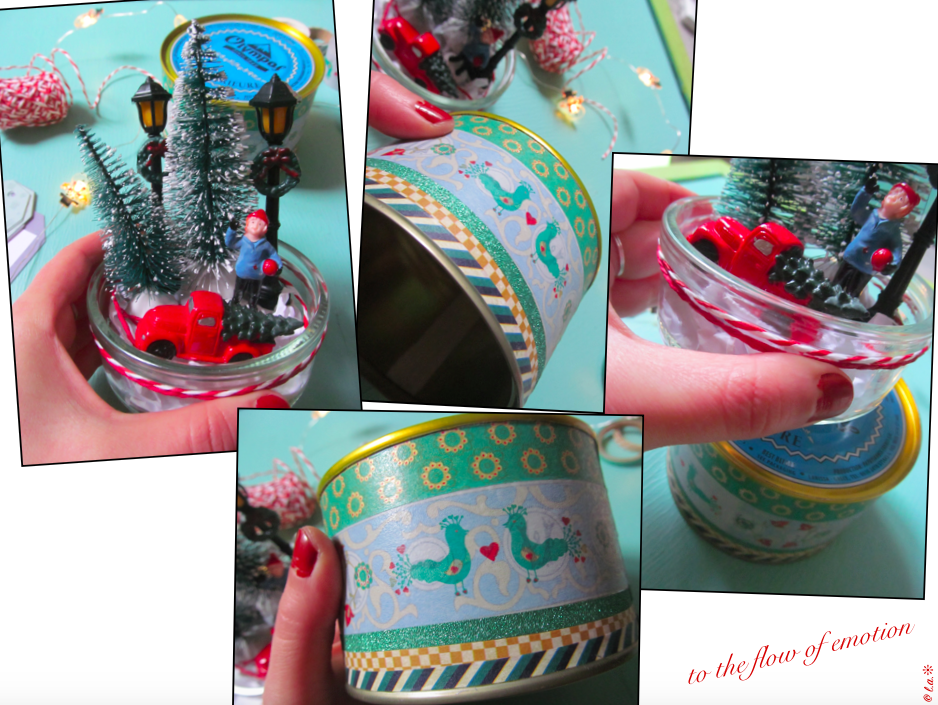 - Une décoration avec des figurines, des boites de conserves, des petits pots en verre, du joli maskingtape, tissu ou peinture, l’idée est de faire avec ce que l’on a 😉