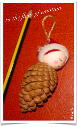 - Des petits bonhommes avec une pomme de pin, une grosse perle pour la tête et un petit chapeau avec un bout de feutrine ou de tissu 😉