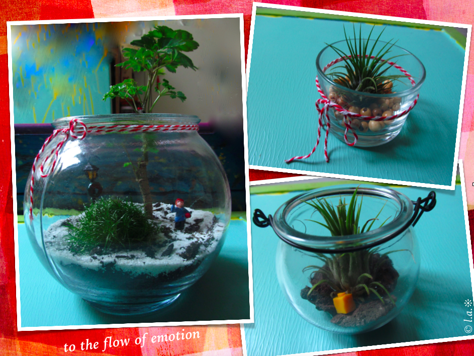 Un vieil aquarium qu’on n’utilise plus, des pots en verre, même des pots de confiture, des perles, des rubans + un peu de terre et des boutures ou des petits plants, et voilà !